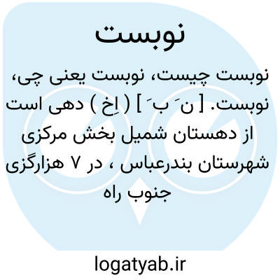 نوبست. [ ن َ ب َ ] ( اِخ ) دهی است از دهستان شمیل بخش مرکزی شهرستان بندرعباس، در 7 هزارگزی جنوب راه میناب به بندرعباس، در جلگه گرمسیری واقع است و 120 تن سکنه دارد. آبش از رودخانه و چاه، محصولش غلات و خرما، شغل مردمش زراعت است. مزرعه خوش آمدی جزو این دهکده است. ( از فرهنگ جغرافیایی ایران ج 8 ).