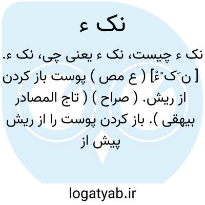 نک ء. [ ن َک ْءْ] ( ع مص ) پوست باز کردن از ریش. ( صراح ) ( تاج المصادر بیهقی ). باز کردن پوست را از ریش پیش از به شدن پس ریم به هم رسانیدن. ( از منتهی الارب ) ( آنندراج ) ( از اقرب الموارد ) ( از متن اللغة ). || کشتن دشمن را. ( از منتهی الارب ) ( آنندراج ). مجروح کردن و کشتن دشمن را. ( از ناظم الاطباء ) ( از اقرب الموارد ). پراکنده و مغلوب کردن خصم را. لغتی است در نکایة. ( از متن اللغة ). || گزاردن حق کسی را. ( از منتهی الارب ) ( آنندراج ) ( از اقرب الموارد ) ( از متن اللغة ).