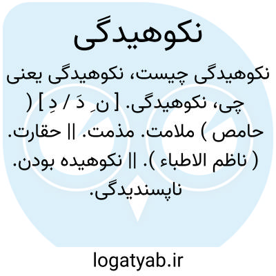 نکوهیدگی. [ ن ِ دَ / دِ ] ( حامص ) ملامت. مذمت. || حقارت. ( ناظم الاطباء ). || نکوهیده بودن. ناپسندیدگی. زشت و مذموم بودن. رجوع به نکوهیده شود.