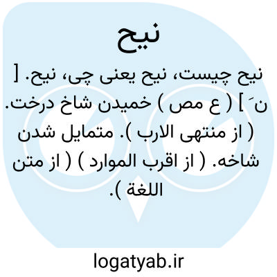 نیح. [ ن َ ] ( ع مص ) خمیدن شاخ درخت. ( از منتهی الارب ). متمایل شدن شاخه. ( از اقرب الموارد ) ( از متن اللغة ). نیحان. ( اقرب الموارد ) ( متن اللغة ). || درشت و سخت گردیدن استخوان پیر یا جوان بر اثر رطوبت. ( از اقرب الموارد ) ( از منتهی الارب ).