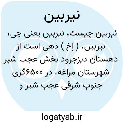 نیربین. ( اِخ ) دهی است از دهستان دیزجرود بخش عجب شیر شهرستان مراغه. در 6500گزی جنوب شرقی عجب شیر و 2500گزی غرب جاده مراغه به دهخوارقان و در جلگه معتدل مالاریائی واقع و دارای 463 تن سکنه است. آبش از قلعه چای و چاه، محصولش غلات، کشمش، بادام و شغل اهالی زراعت است. ( از فرهنگ جغرافیائی ایران ج 4 ).