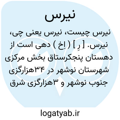 نیرس. [ رِ ] ( اِخ ) دهی است از دهستان پنجکرستاق بخش مرکزی شهرستان نوشهر در 34هزارگزی جنوب نوشهر و 3هزارگزی شرق جاده چالوس که در منطقه کوهستانی سردسیری واقع است و 350 تن سکنه دارد. آبش از چشمه، محصولش غلات و ارزن و شغل اهالی زراعت و تهیه زغال و چوب است. ( از فرهنگ جغرافیائی ایران ج 3 ).