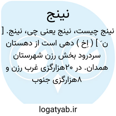 نینج. [ ن َ ] ( اِخ ) دهی است از دهستان سردرود بخش رزن شهرستان همدان. در 20هزارگزی غرب رزن و 8هزارگزی جنوب دمق، در دامنه سردسیری واقع است و 387 تن سکنه دارد. آبش از چشمه، محصولش غلات و لبنیات، شغل اهالی زراعت و گله داری است. ( از فرهنگ جغرافیائی ایران ج 5 ).