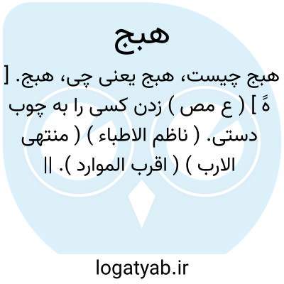 هبج. [ هََ ] ( ع مص ) زدن کسی را به چوب دستی. ( ناظم الاطباء ) ( منتهی الارب ) ( اقرب الموارد ). || استعاره است نزد عوام برای جدا کردن برنج از پوستش بوسیله چوب زدن. ( معجم متن اللغة ). || آرام و پی در پی زدن. ( اقرب الموارد ) ( معجم متن اللغة ).
