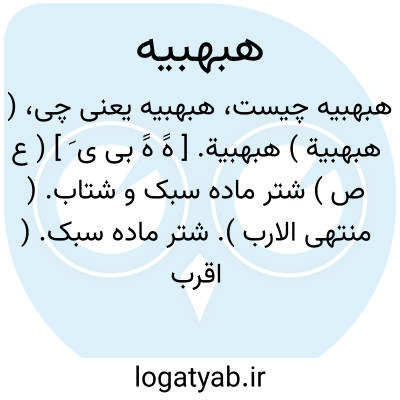 ( هبهبیة ) هبهبیة. [ هََ هََ بی ی َ ] ( ع ص ) شتر ماده سبک و شتاب. ( منتهی الارب ). شتر ماده سبک. ( اقرب الموارد ). شتر ماده ضعیف. ( ناظم الاطباء ). شتر ماده سبک تیزرو. ( لسان العرب ). ابن احمر گوید: