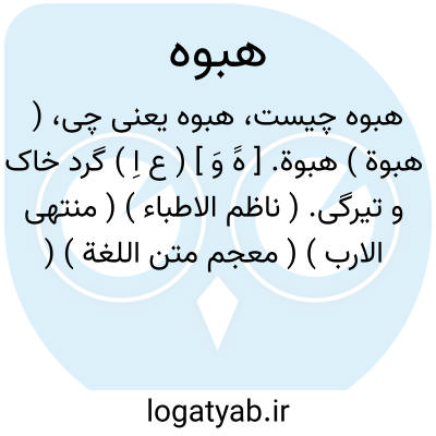 لغت نامه دهخدا ( هبوة ) هبوة. [ هََ وَ ] ( ع اِ ) گرد خاک و تیرگی. ( ناظم الاطباء ) ( منتهی الارب ) ( معجم متن اللغة ) ( اقرب الموارد ). ج، هَبَوات. ( معجم متن اللغة ) ( اقرب الموارد )، اهباء. ( معجم متن اللغة ).