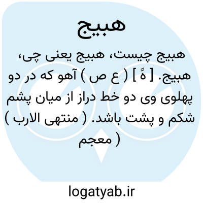 هبیج. [ هََ ] ( ع ص ) آهو که در دو پهلوی وی دو خط دراز از میان پشم شکم و پشت باشد. ( منتهی الارب ) ( معجم متن اللغة ) ( اقرب الموارد ). آهویی که در هر یک از دو پهلوی وی خطی دراز میان پشم شکم و پشت وی باشد. ( ناظم الاطباء ).