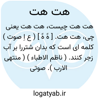 هت هت. [ هََ هََ ] ( ع اِ صوت ) کلمه ای است که بدان شتررا بر آب زجر کنند. ( ناظم الاطباء ) ( منتهی الارب ). صوتی است که بدان شتر را به سوی آب رانند. ( اقرب الموارد ). اذا وقف البعیر علی الردهة فلاتقل له هت هت، مثلی است که برای ترک اصرار در پند و اندرز در مورد کسی که هوش وی آشکار باشد، گفته میشود. ( اقرب الموارد ).