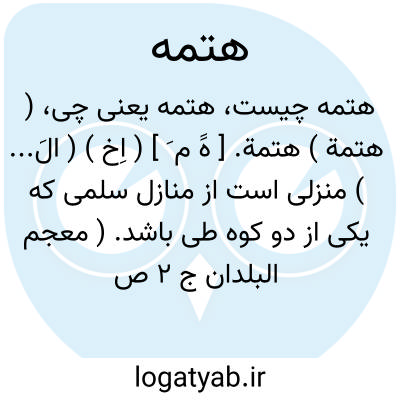 لغت نامه دهخدا ( هتمة ) هتمة. [ هََ م َ ] ( اِخ ) ( الَ... ) منزلی است از منازل سلمی که یکی از دو کوه طی باشد. ( معجم البلدان ج 2 ص 392 ) ( معجم متن اللغة ). موضعی است به کوه سلمی. ( منتهی الارب ).