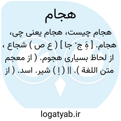 هجام. [ هَِ ج ْ جا ] ( ع ص ) شجاع، از لحاظ بسیاری هجوم. ( از معجم متن اللغة ). || ( اِ ) شیر. اسد. ( از معجم متن اللغة ).