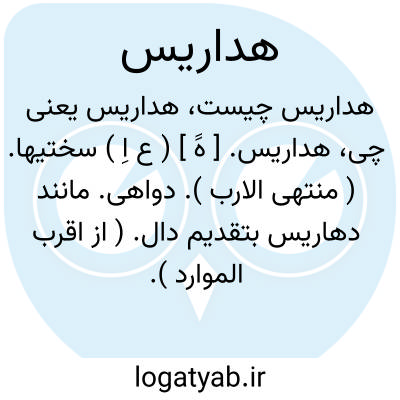 هداریس. [ هََ ] ( ع اِ ) سختیها. ( منتهی الارب ). دواهی. مانند دهاریس بتقدیم دال. ( از اقرب الموارد ).