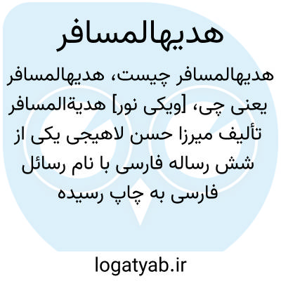 [ویکی نور] هدیةالمسافر تألیف میرزا حسن لاهیجى یکی از شش رساله فارسی با نام رسائل فارسی به چاپ رسیده است. این رساله در بیان اقسام و احوال مسافر و احکام او مى باشد.