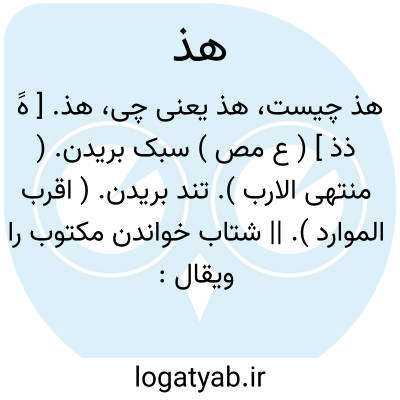 هذ. [ هََ ذذ ] ( ع مص ) سبک بریدن. ( منتهی الارب ). تند بریدن. ( اقرب الموارد ). || شتاب خواندن مکتوب را ویقال: یهذ القرآن و الحدیث؛ ای یرده. ( منتهی الارب ).شتاب خواندن قرآن را. || نقل کردن حدیث را. ( از اقرب الموارد ). || ( ص ) برنده. ( منتهی الارب ). در اقرب الموارد این معنی به کسر اول است.