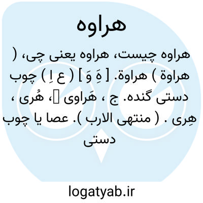 ( هراوة ) هراوة. [ هَِ وَ ] ( ع اِ ) چوب دستی گنده. ج، هَراوی ̍، هُری، هِری. ( منتهی الارب ). عصا یا چوب دستی ضخیم چون دسته تبر و کلنگ. ج، هراوی، هَری، هِری. ( اقرب الموارد ).