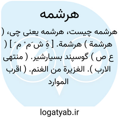 لغت نامه دهخدا ( هرشمة ) هرشمة. [ هَِ ش َم ْ م َ ] ( ع ص ) گوسپند بسیارشیر. ( منتهی الارب ). الغزیرة من الغنم. ( اقرب الموارد ). || زمین درشت. ( منتهی الارب ) ( اقرب الموارد ).
