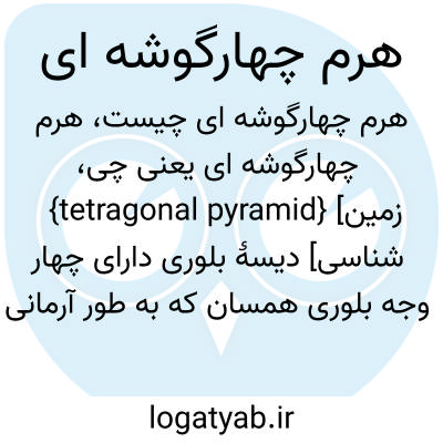 {tetragonal pyramid} [زمین شناسی] دیسۀ بلوری دارای چهار وجه بلوری همسان که به طور آرمانی مثلث های متساوی الساقین موجود در یک هرم با برش عرضی مربع هستند متـ. هرم چهارگوش