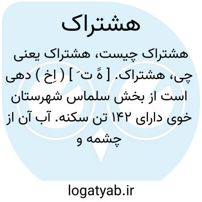 هشتراک. [ هََ ت َ ] ( اِخ ) دهی است از بخش سلماس شهرستان خوی دارای 142 تن سکنه. آب آن از چشمه و محصول عمده اش غله و توتون است. ( از فرهنگ جغرافیائی ایران ج 4 ).
