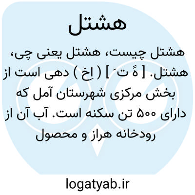 هشتل. [ هََ ت َ ] ( اِخ ) دهی است از بخش مرکزی شهرستان آمل که دارای 500 تن سکنه است. آب آن از رودخانه هراز و محصول عمده اش برنج، جو،حبوب و صیفی است. ( از فرهنگ جغرافیائی ایران ج 3 ).