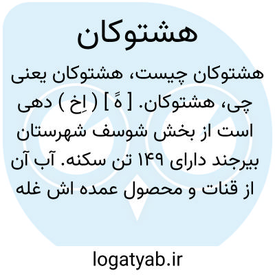 هشتوکان. [ هََ ] ( اِخ ) دهی است از بخش شوسف شهرستان بیرجند دارای 149 تن سکنه. آب آن از قنات و محصول عمده اش غله و لبنیات است. ( از فرهنگ جغرافیائی ایران ج 9 ).