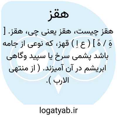 هقز. [ هَِ / هََ ] ( ع اِ ) قهز، که نوعی از جامه باشد پشمی سرخ یا سپید وگاهی ابریشم در آن آمیزند. ( از منتهی الارب ). صورتی از کلمه قهر ( با راء مهمله ) است. ( اقرب الموارد ).