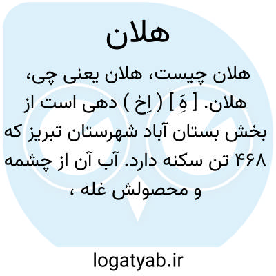 هلان. [ هَِ ] ( اِخ ) دهی است از بخش بستان آباد شهرستان تبریز که 468 تن سکنه دارد. آب آن از چشمه و محصولش غله، یونجه و سیب زمینی است. ( از فرهنگ جغرافیائی ایران ج 4 ).