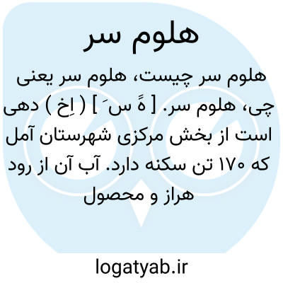 هلوم سر. [ هََ س َ ] ( اِخ ) دهی است از بخش مرکزی شهرستان آمل که 170 تن سکنه دارد. آب آن از رود هراز و محصول عمده اش برنج، غله، ذغال و کاردستی مردم شال بافی است. ( از فرهنگ جغرافیائی ایران ج 3 ).