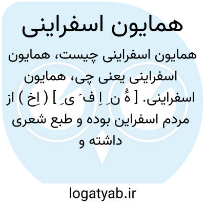 همایون اسفراینی. [ هَُ ن ِ اِ ف َ ی ِ ] ( اِخ ) از مردم اسفراین بوده و طبع شعری داشته و ظاهراً منحرف و دیوانه مزاج بوده است. رجوع به مجمعالفصحاء چ سنگی ج 2 ص 55 و نیز رجوع به مجالس النفائس ص 139 از ترجمه فارسی شود.