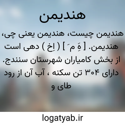 هندیمن. [ هَِ م َ ] ( اِخ ) دهی است از بخش کامیاران شهرستان سنندج. دارای 304 تن سکنه، آب آن از رود طای و چشمه و محصول عمده اش غله و انواع لبنیات است. ( از فرهنگ جغرافیایی ایران ج 5 ).