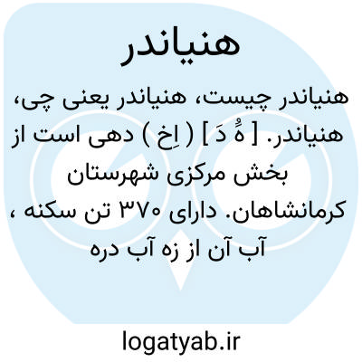 هنیاندر. [ هَُ دَ ] ( اِخ ) دهی است از بخش مرکزی شهرستان کرمانشاهان. دارای 370 تن سکنه، آب آن از زه آب دره محلی و محصول عمده اش غله، حبوب، توتون، میوه و چوب و کار دستی مردم آنجا بافتن قالیچه و گلیم و جاجیم است. ( از فرهنگ جغرافیایی ایران ج 5 ).
