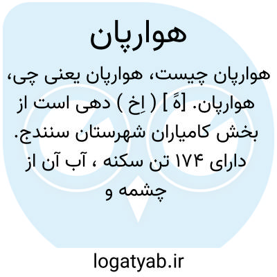 هوارپان. [هََ ] ( اِخ ) دهی است از بخش کامیاران شهرستان سنندج. دارای 174 تن سکنه، آب آن از چشمه و محصول عمده اش غله و لبنیات است. ( از فرهنگ جغرافیایی ایران ج 5 ).