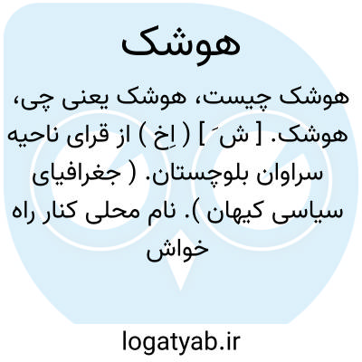 هوشک. [ ش َ ] ( اِخ ) از قرای ناحیه سراوان بلوچستان. ( جغرافیای سیاسی کیهان ). نام محلی کنار راه خواش وداورپناه میان کهن داود و بخشان. ( یادداشت مؤلف ).