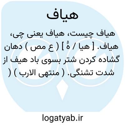 هیاف. [ هیا / هَُ ] ( ع مص ) دهان گشاده کردن شتر بسوی باد هیف از شدت تشنگی. ( منتهی الارب ) ( آنندراج ). و در اقرب الموارد هیاف به کسر هاء و فتح آن به این معنی آمده است.
