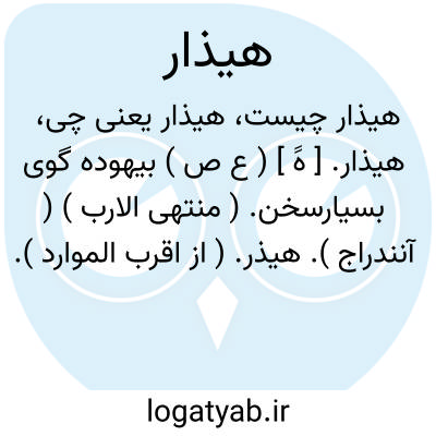 لغت نامه دهخدا هیذار. [ هََ ] ( ع ص ) بیهوده گوی بسیارسخن. ( منتهی الارب ) ( آنندراج ). هیذر. ( از اقرب الموارد ).