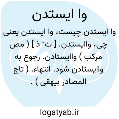 لغت نامه دهخدا واایستدن. [ ت َ دَ ] ( مص مرکب ) واایستادن. رجوع به واایستادن شود. انتهاء. ( تاج المصادر بیهقی ). انقداع. ( تاج المصادر بیهقی ).