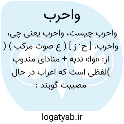واحرب. [ ح َ رَ ] ( ع صوت مرکب ) ( از: «وا» ندبه + منادای مندوب )لفظی است که اعراب در حال مصیبت گویند: