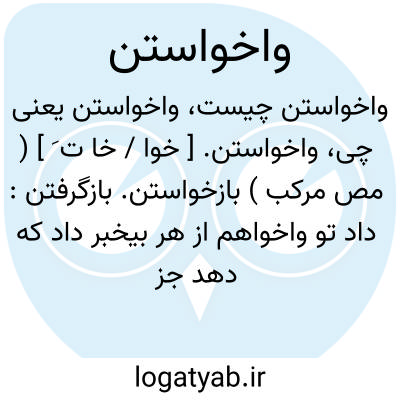 لغت نامه دهخدا واخواستن. [ خوا / خا ت َ ] ( مص مرکب ) بازخواستن. بازگرفتن: داد تو واخواهم از هر بیخبرداد که دهد جز خدای دادگر.مولوی.هرچه که نتوانی از آن خاستن زشت بود دادن و واخواستن..طفل بود کز خرد ناتوان هرچه دهد بازستاند روان.امیرخسرو.