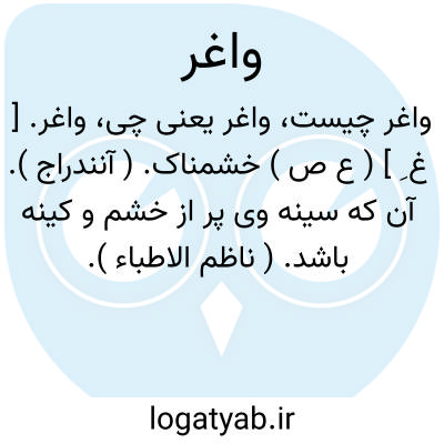 واغر. [ غ ِ ] ( ع ص ) خشمناک. ( آنندراج ). آن که سینه وی پر از خشم و کینه باشد. ( ناظم الاطباء ).