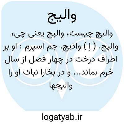 والیج. ( اِ ) وادیج. جم اسپرم: او بر اطراف درخت در چهار فصل از سال خرم بماند... و در بخارا نبات او را والیجها کنند چنانکه تاک را. ( ترجمه صیدنه ابوریحان نسخه خطی کتابخانه ٔمرحوم دهخدا و نیز نسخه چاپی زکی و لیدی توغان ).