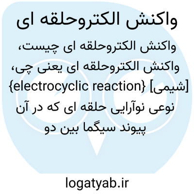 {electrocyclic reaction} [شیمی] نوعی نوآرایی حلقه ای که در آن پیوند سیگما بین دو اتم کربن انتهایی یک مولکول مزدوج شکل می گیرد و به کاهش یکی از پیوندهای موجود منجر می شود