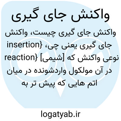فرهنگستان زبان و ادب {insertion reaction} [شیمی] نوعی واکنش که در آن مولکول واردشونده در میان اتم هایی که پیش تر به یکدیگر پیوند خورده اند، قرار می گیرد