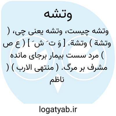 ( وتشة ) وتشة. [ وَ ت َ ش َ ] ( ع ص ) مرد سست بیمار برجای مانده مشرف بر مرگ. ( منتهی الارب ) ( ناظم الاطباء ) ( اقرب الموارد ) ( آنندراج ).