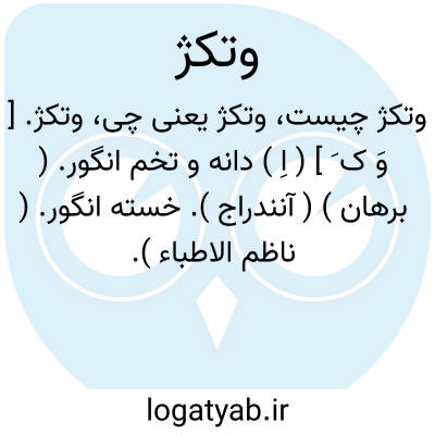 لغت نامه دهخدا وتکژ. [ وَ ک َ ] ( اِ ) دانه و تخم انگور. ( برهان ) ( آنندراج ). خسته انگور. ( ناظم الاطباء ).