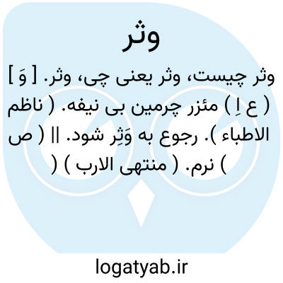 وثر. [ وَ ث ِ ] ( ع ص ) نرم. || پاسپرده. ( منتهی الارب ) ( آنندراج ) ( ناظم الاطباء ). || ( اِ ) آب گشن در رحم ناقه که از وی آبستن نشود. || مئزر چرمین بی نیفه که دختران خردسال پوشند و آن تسمهاست به درازا شکافته به عرض چهار انگشت یا یک وجب یا مئرز بی ساق شبیه صدار. ( منتهی الارب ) ( آنندراج ).
