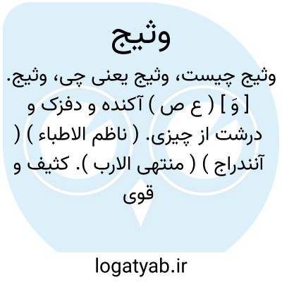 وثیج. [ وَ ] ( ع ص ) آکنده و دفزک و درشت از چیزی. ( ناظم الاطباء ) ( آنندراج ) ( منتهی الارب ). کثیف و قوی و مکتنز. ( اقرب الموارد ).