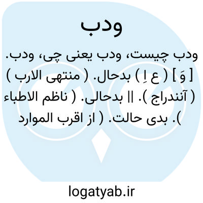 ودب. [ وَ ] ( ع اِ ) بدحال. ( منتهی الارب ) ( آنندراج ). || بدحالی. ( ناظم الاطباء ). بدی حالت. ( از اقرب الموارد ) ( ناظم الاطباء ). بدی حال. ( اقرب الموارد ).