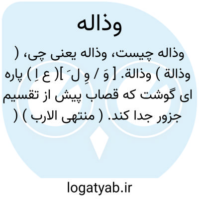 ( وذالة ) وذالة. [ وَ / وِ ل َ ]( ع اِ ) پاره ای گوشت که قصاب پیش از تقسیم جزور جدا کند. ( منتهی الارب ) ( ناظم الاطباء ) ( آنندراج ) ( اقرب الموارد ). در اقرب الموارد فقط به فتح واو آمده است.