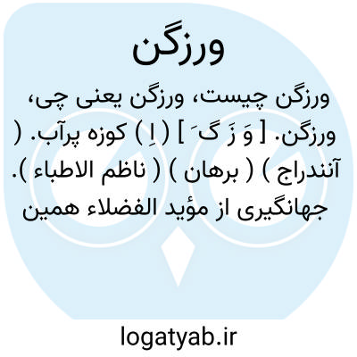 ورزگن. [ وَ زَ گ َ ] ( اِ ) کوزه پرآب. ( آنندراج ) ( برهان ) ( ناظم الاطباء ). جهانگیری از مؤید الفضلاء همین لفظ و معنی را نقل کرده، مؤلف فرهنگ نظام گوید: لفظ و معنی عجیبی است. ( حاشیه برهان قاطع چ معین ).