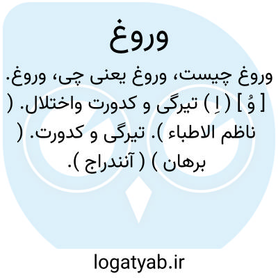 وروغ. [ وُ ] ( اِ ) تیرگی و کدورت واختلال. ( ناظم الاطباء ). تیرگی و کدورت. ( برهان ) ( آنندراج ). مقابل فروغ. ( فرهنگ فارسی معین ):
