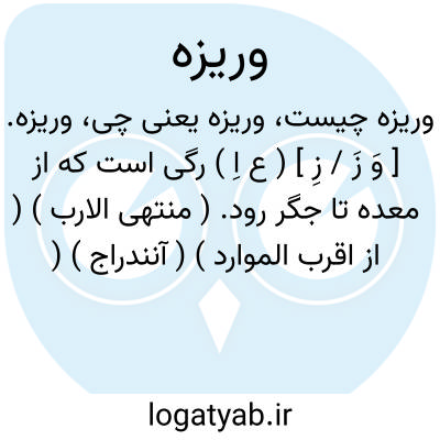 لغت نامه دهخدا وریزه. [ وَ زَ / زِ ] ( ع اِ ) رگی است که از معده تا جگر رود. ( منتهی الارب ) ( از اقرب الموارد ) ( آنندراج ) ( ناظم الاطباء ).