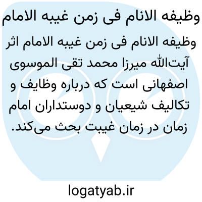 [ویکی فقه] وظیفه الانام فی زمن غیبه الامام (کتاب). وظیفة الانام فی زمن غیبة الامام علیه السّلام به زبان عربی اثر میرزا محمدتقی موسوی اصفهانی (۱۲۶۲- ۱۳۰۸ ق) می باشد.اثر به بیان پنجاه و چهار وظیفه برای شیعیان و محبین امام زمان عجّل الله فرجه الشریف در دوران غیبت که باید بر آن ها مواظبت و عمل نمایند، پرداخته است.می توان گفت اثر، دستور العمل شیعیان در دوران غیبت می باشد.
